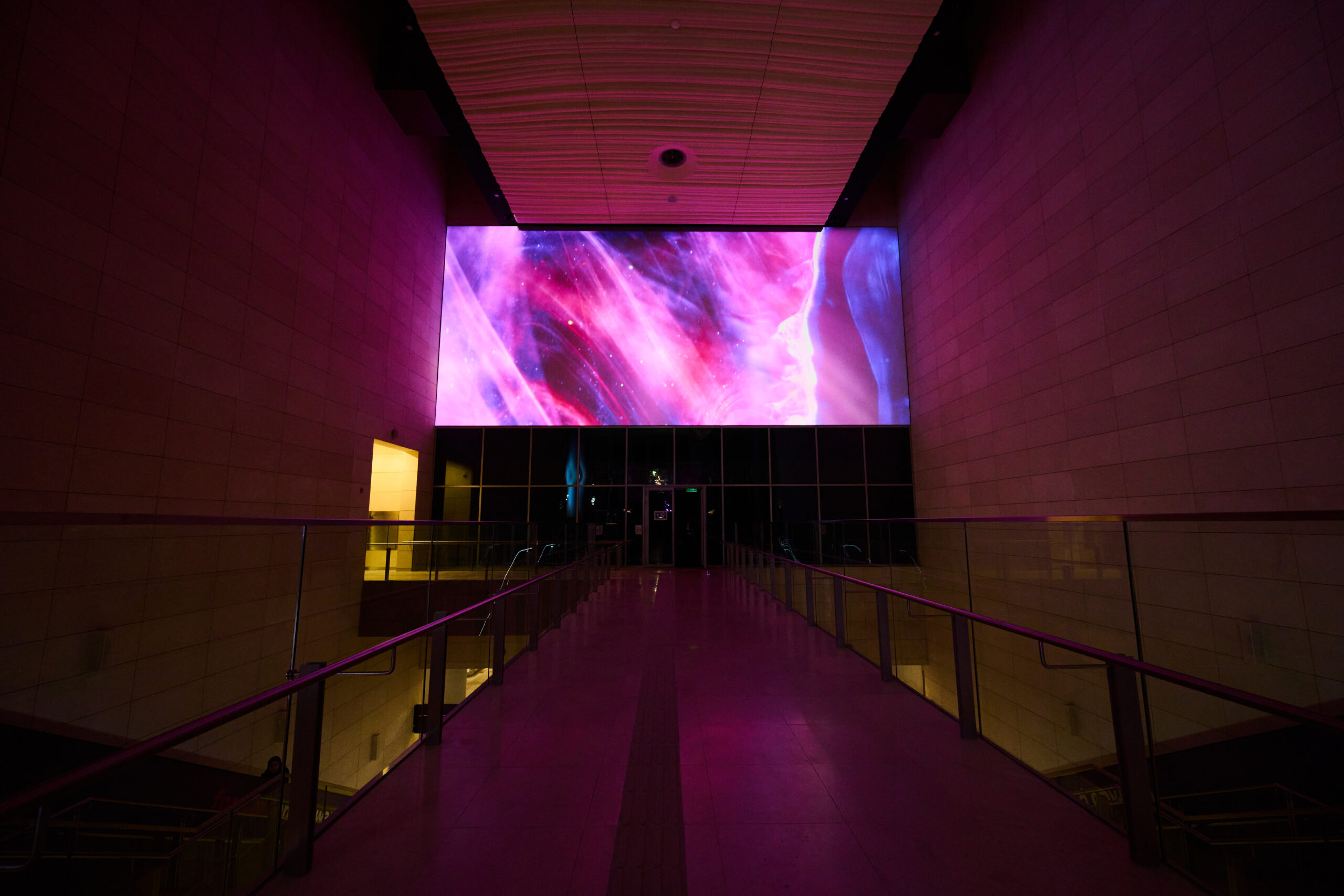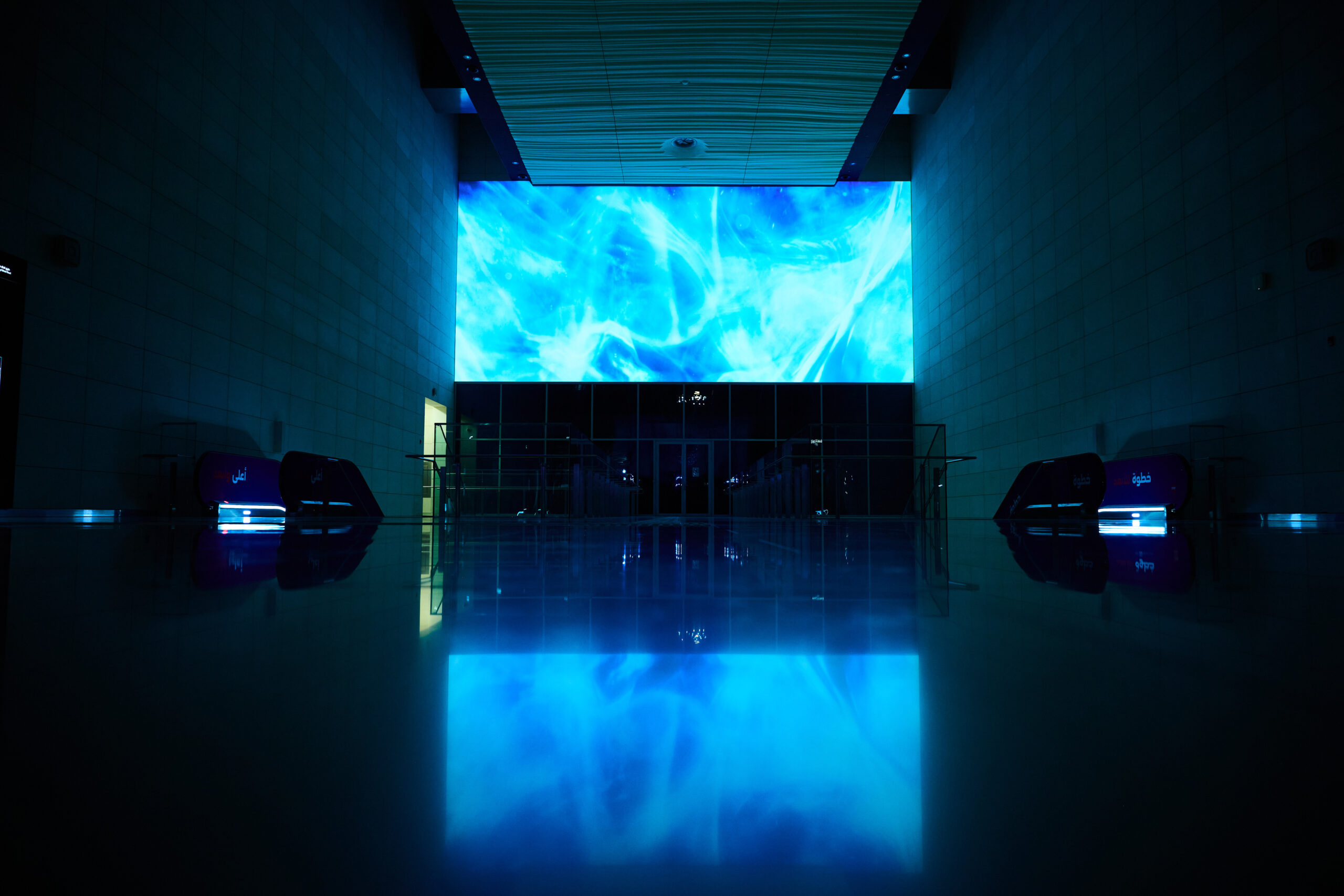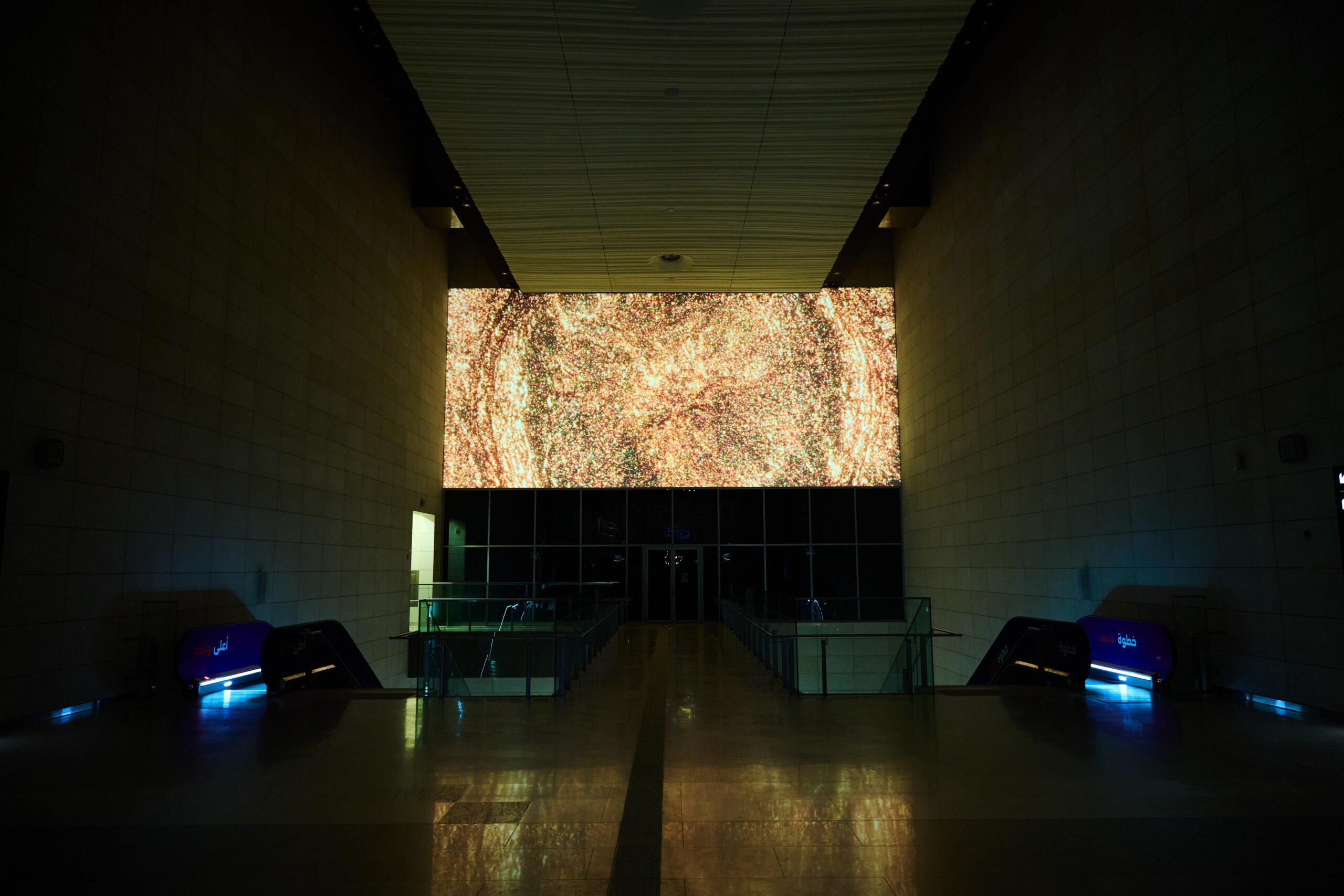 Inflow/Outflow (2025) by French filmmaker Roman Hill translates microscopic realities into monumental projections. Illumination magnifies chemical reactions filmed through polarized light, expanding them to an architectural scale. Color and texture cascade like slow galaxies, enveloping surfaces in living pigment. Hill’s imagery, neither abstract nor representational, invites contemplation of unseen beauty, the quiet intelligence of matter in transformation. By revealing the sublime within the small, the work bridges science and mysticism. Projected onto Riyadh’s urban fabric, it turns concrete into skin, metal into film. Hill calls it “a portrait of energy itself,” and indeed it feels elemental: creation and dissolution rendered in luminous motion.